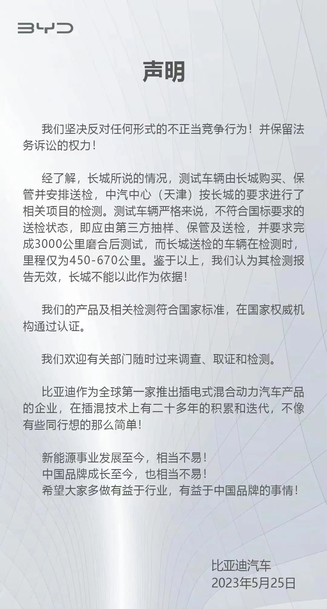上周长城举报比亚迪不合规的事件一下成为行业热点。而本周一开始,比亚迪再次发布长文回应此次事件。