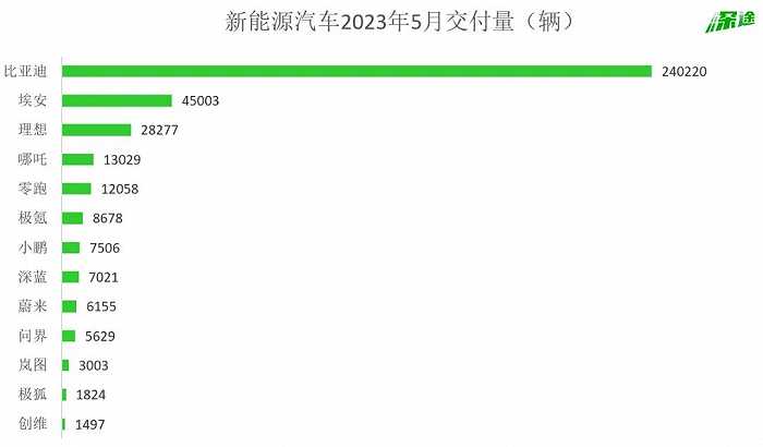 截至6月1日公布的数据显示,有五家新能源厂商交付量过万,比亚迪以240220辆的交付量继续甩开同行,埃安以45003辆的交付量位居第二。