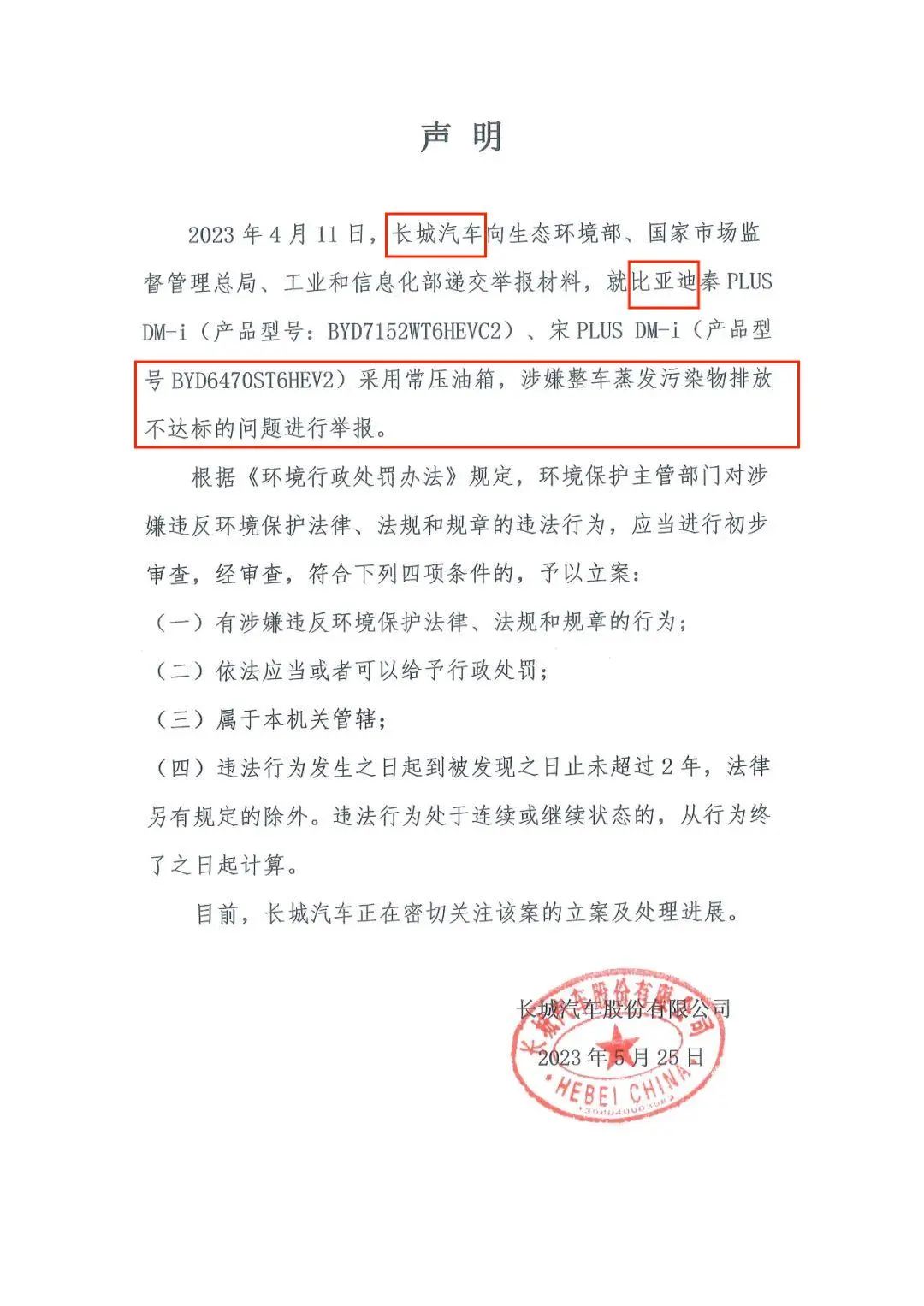 5月25日中午,长城汽车官微突然发布声明:2023年4月11日,长城汽车向生态环境部、国家市场监督管理总局、工业和信息化部递交举报材料,就比亚迪部分车型采用常压油箱,涉嫌整车蒸发污染物排放不达标的问题进行举报。
