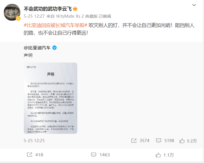 比亚迪公司品牌及公关处总经理李云飞5月25日午间在社交账户评论:“吹灭别人的灯,并不会让自己更加光明!阻挡别人的路,也不会让自己行得更远!”