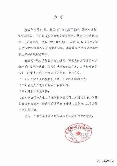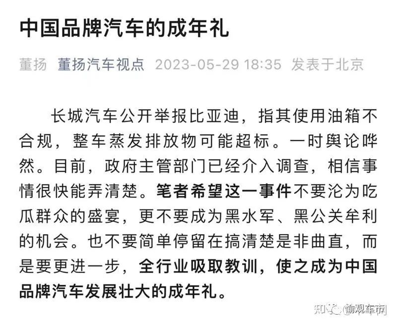 2023年5月29日,原中国汽车工业协会常务副会长董扬先生发表了一篇文章《中国品牌汽车的成年礼》,就长城举报比亚迪在秦和宋两款车型上使用常压油箱,涉嫌污染物排放超标一事发表意见,在文中董扬先生也提到:政府主管部门已经介入调查。相信事情很快弄清楚。