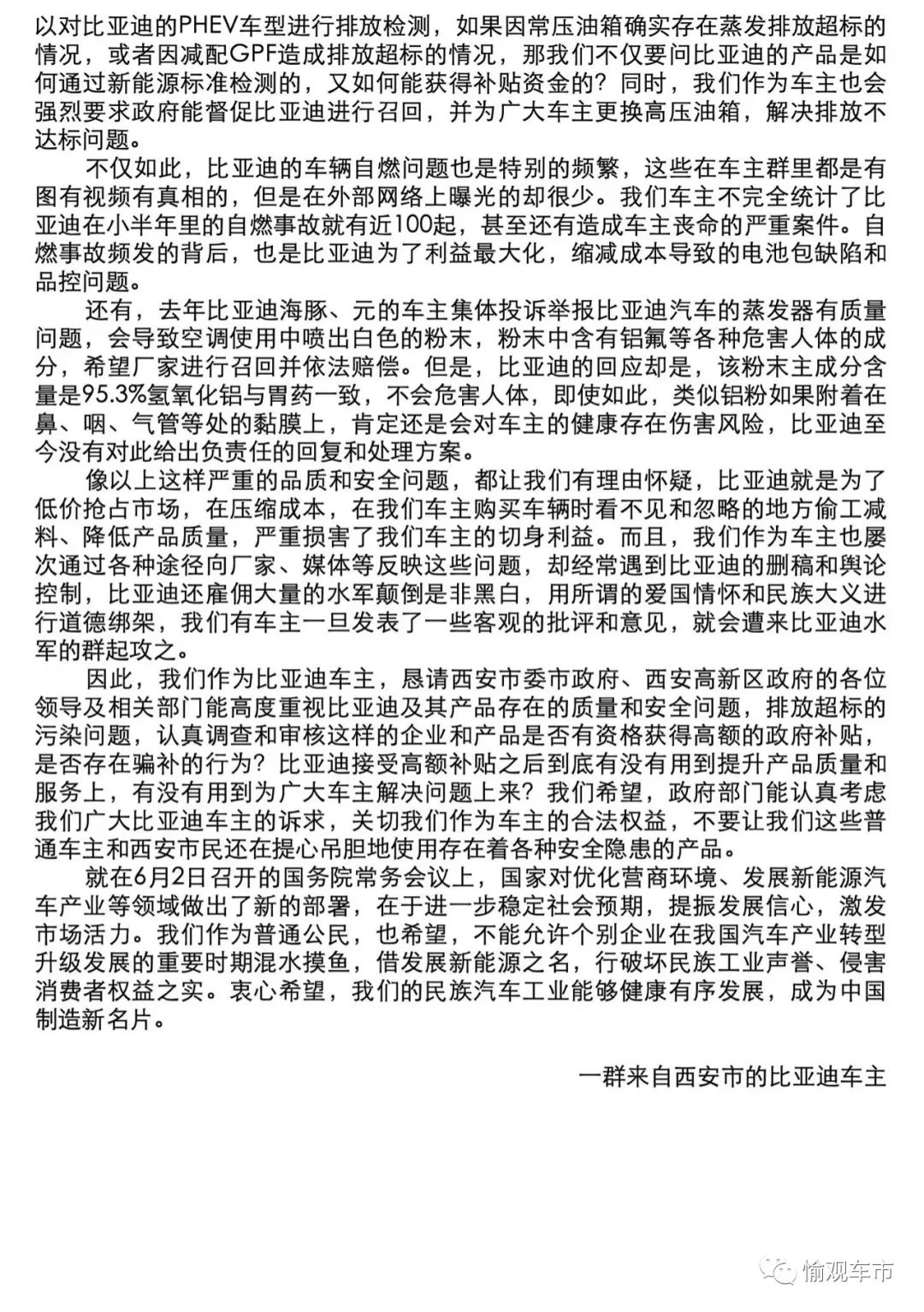 愉观车市手上的材料也显示:自称一群来西安的比亚迪车主已经写信给相关部门领导要求政府部门进行进一步调查审核。?????????????????????