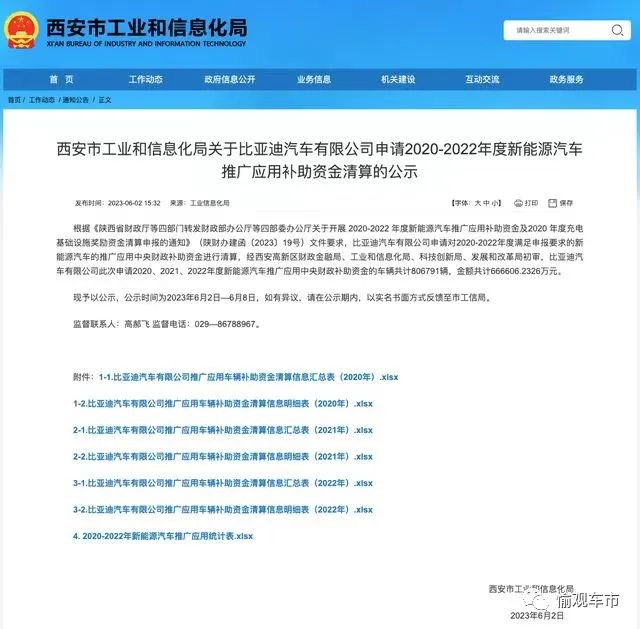 根据西安市工业和信息化局网站6月2日15:32发布的《西安市工业和信息化局关于比亚迪汽车有限公司申请2020-2022年度新能源汽车推广应用补助资金清算公示》(下称《公示》)显示: