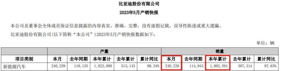 据数据显示,2023年5月,比亚迪新能源汽车销量24.02万辆,同比增长108.99%,刷新单月销量记录,更是仅仅5个月,销量累积突破百万辆。
