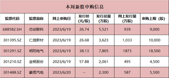 根据发行安排,芯动联科、仁信新材、明阳电气、金杨股份将于本周一申购;豪恩汽电将于周二申购。