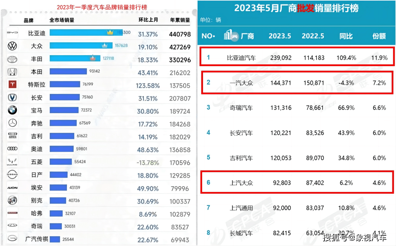 进入21世纪,奇瑞、长城、吉利、比亚迪等自主品牌纷纷崛起,开始吹响反攻号角。尤其是比亚迪,乘着新能源汽车的东风,在2022年爆卖186万辆,终于反超南北大众,代表自主品牌首次问鼎国内车市销冠,一举终结合资品牌对中国车市近40年的垄断历史。今年一季度,比亚迪全球大卖50.2万辆,代表自主品牌首次跻身全球十大车企行列,又一次实现历史性突破。