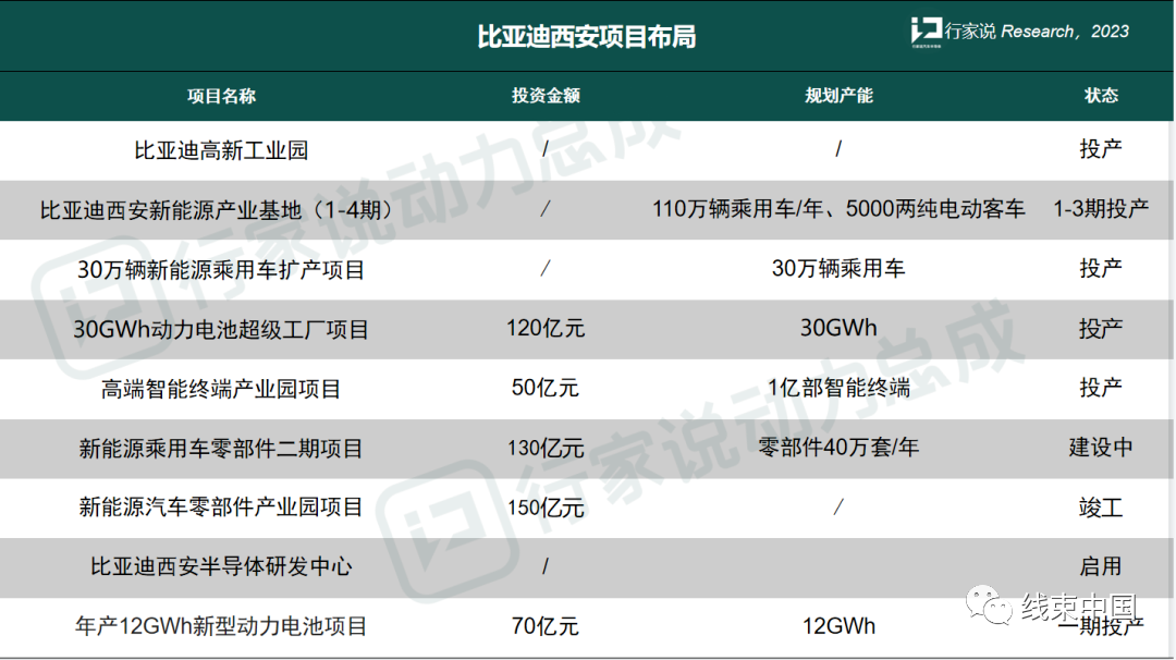 西安已成为比亚迪在北方的总部基地,也是比亚迪除深圳总部外布局最全、业务合作最广的城市之一。据"行家说 Research"统计,比亚迪在西安的投资已经超过520亿元。此外,比亚迪在西安的乘用车产能已超过110万辆,动力电池产能超过42GWh。