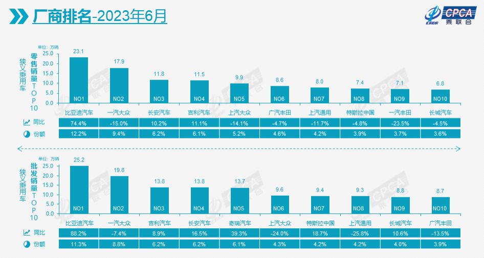 6 月份特斯拉一下子冲进了 TOP 10 榜,虽然零售销量同比下滑了 4.8%,但批发销量达到 9.4 万辆,同比增长了 18.7%。这都因为特斯拉的不识时务,人家那边搞个联盟,大家答应不以非正常价格扰乱市场。可特斯拉自顾自玩,马上就来一波降价冲销量,也不怕惹众怒呀?