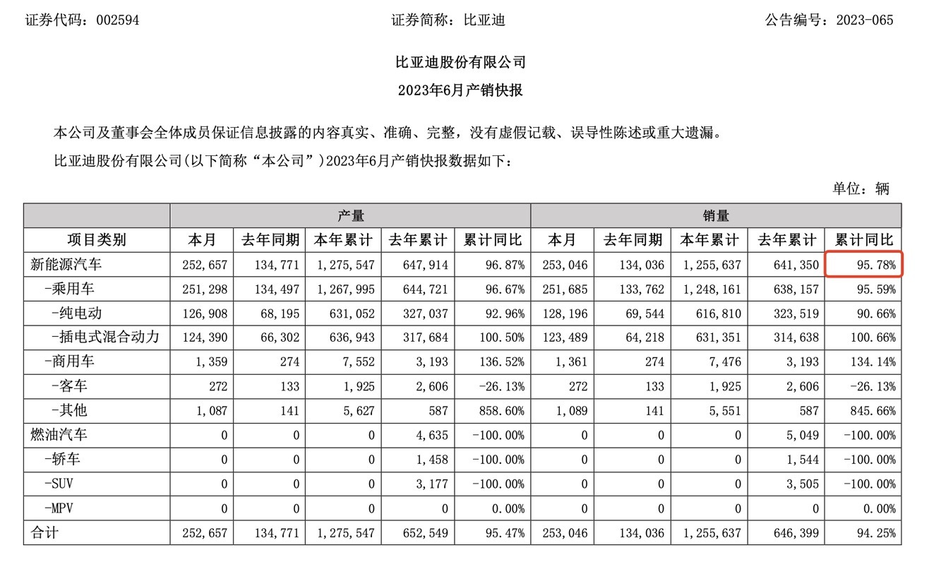7月2日,比亚迪公告,6月新能源汽车销量253046辆,同比增加88.79%,去年同期销量134036辆;今年累计销量约126万辆,同比增加94.25%。全年累计销量同比增长95.78%。