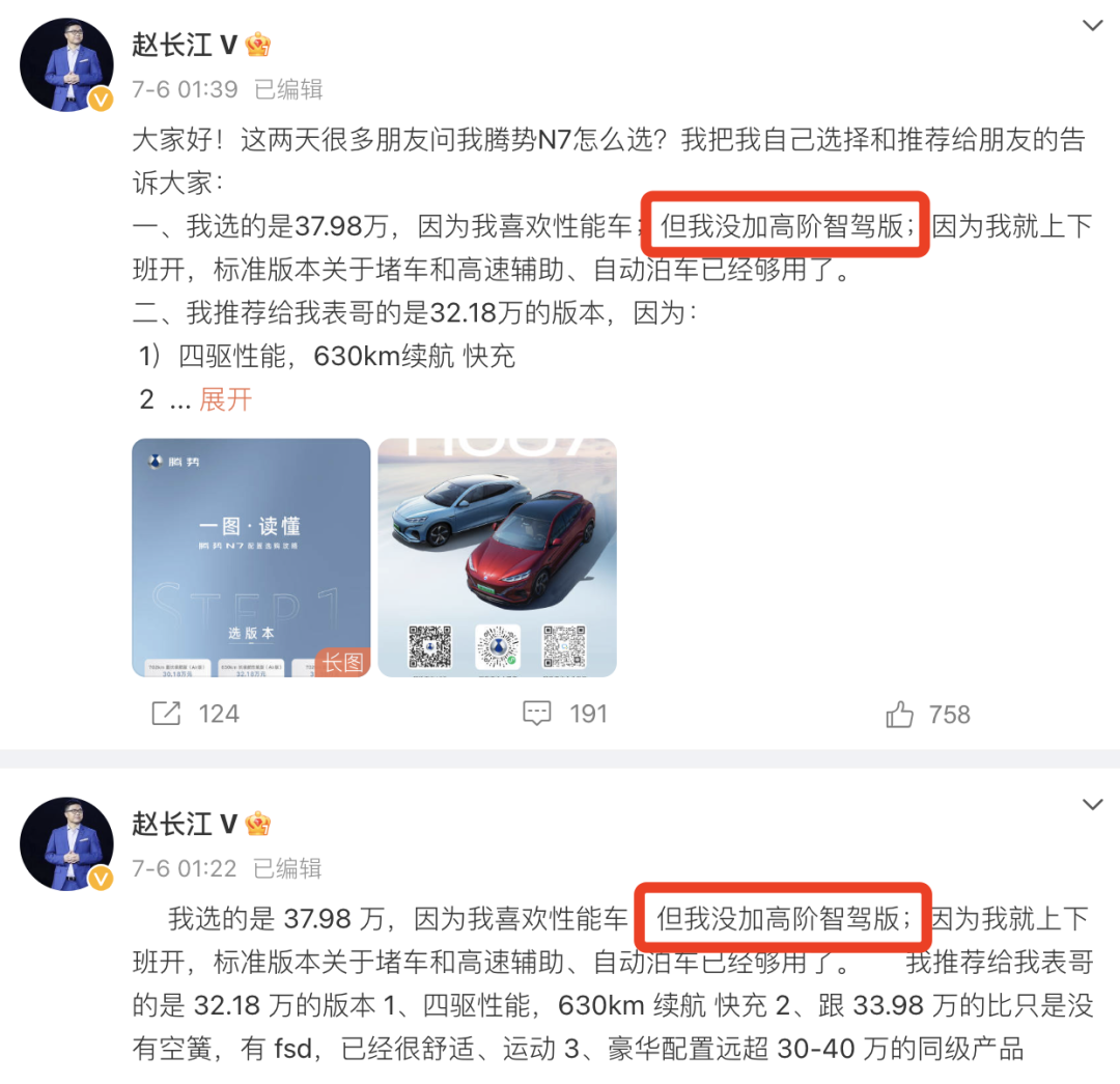 腾势 N7 上市后两天,腾势销售事业部总经理赵长江,在其个人微博上连发两条相同的内容,分享自己的腾势 N7 选配思考。其中他特别强调,自己没有选配价值 2.3 万元的高阶智驾选装包,理由是「我就上下班开,标准版本关于堵车和高速辅助、自动泊车已经够用了」。