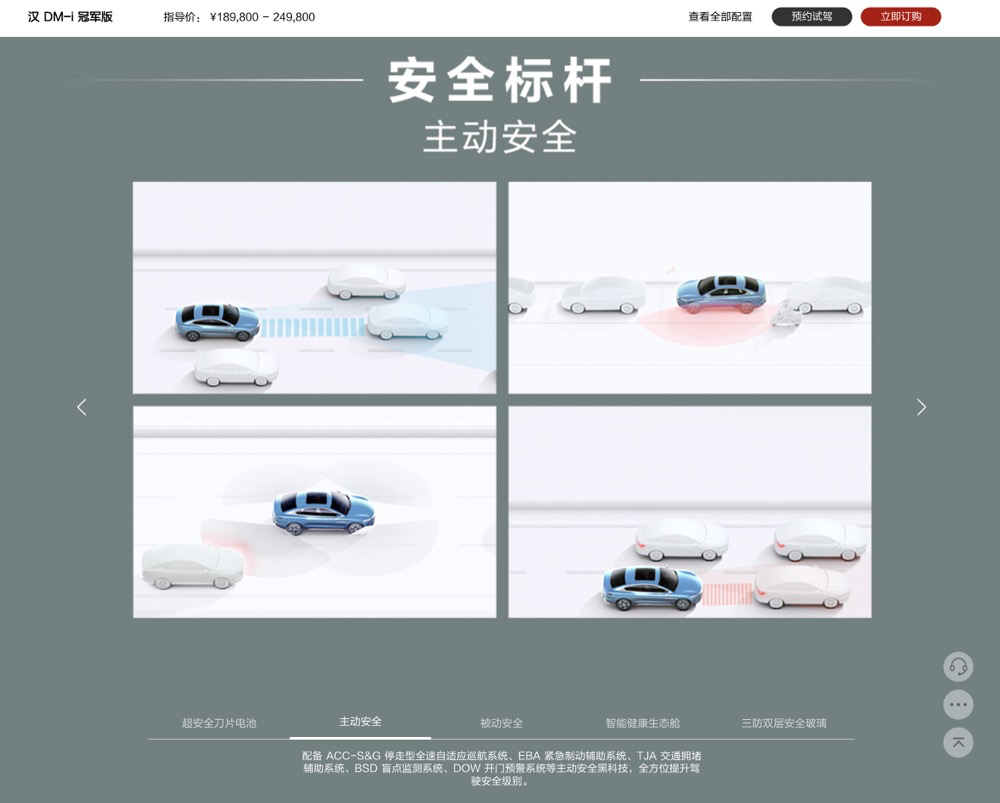 在 2021-2022 年间,比亚迪智能驾驶技术的成长,与战略合作伙伴清单快速增员甚至成反比。2022 年中,海豹正式上市,即使它是 e 平台 3.0 的重要车型,无论是 2022 年首发,还是 2023 年小改款,海豹的官方核心宣传物料都基本没有提及智能驾驶技术。粗略浏览了比亚迪官网,会发现只有汉、唐、护卫舰 07 等少数车型官网有关于智能驾驶功能的介绍。