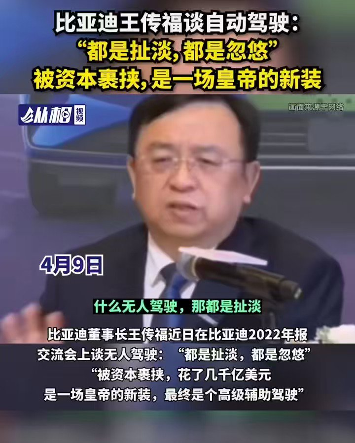 「什么无人驾驶,那都是扯淡,高级驾驶辅助,仅仅而已。他就是一个驾驶辅助的高级配置,被业界传成一个玄乎乎的。资本裹挟,让人类花了几千亿美金,最后到头来就是一个 3000-5000 块钱的高级配置,很少的场景下使用的。这就是比亚迪对这个问题的认识,它就是一场皇帝的新装。」
