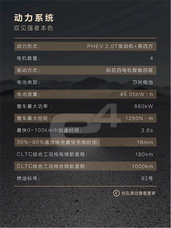 而该车的电池包容量为49.05kW.h,整车四电机最大功率880kW(1196匹),最大扭矩1280N.m,零百加速3.6s,CLTC纯电续航180km,CLTC综合续航将达到1000km。