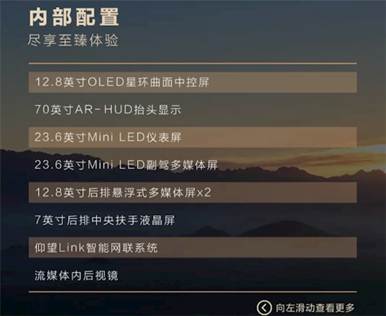 后排则配备了2块12.8英寸悬浮式多媒体屏以及7英寸中央扶手液晶屏。车内一共7块屏幕,将科技氛围拉满。
