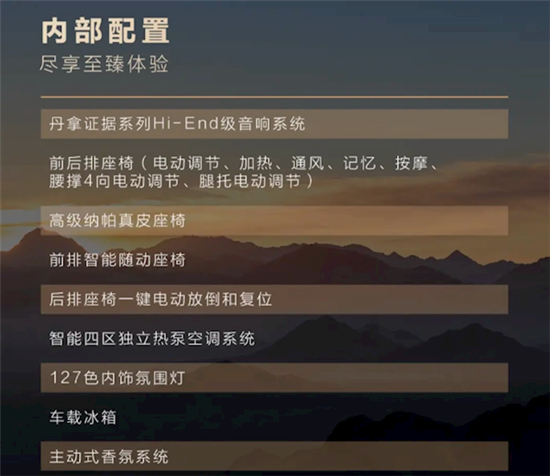 舒适性上,仰望U8豪华版搭载了丹拿音响,纳帕真皮座椅、前后排座椅电动调节/加热/通风/记忆/按摩、前排智能隧洞座椅、四区独立热泵空调、车载冰箱、主动香氛等。