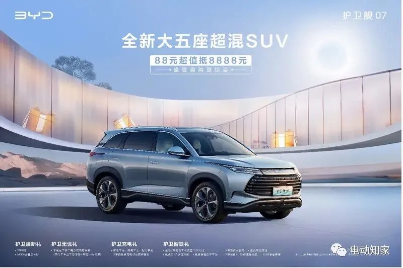 8月3日,比亚迪护卫舰07推出限时购车优惠政策【护卫五重礼】,消费者在2023年8月1日至9月30日期间完成购车,即可享受88元抵扣8888元购车款钜惠等多重好礼。同时可享“2年0息”、“5000元置换补贴”、“2年免费车机流量”、“免费在线导航和智能语音”、“首任车主三电系统终身保修和2年内赠送/安装充电桩”等多重好礼。