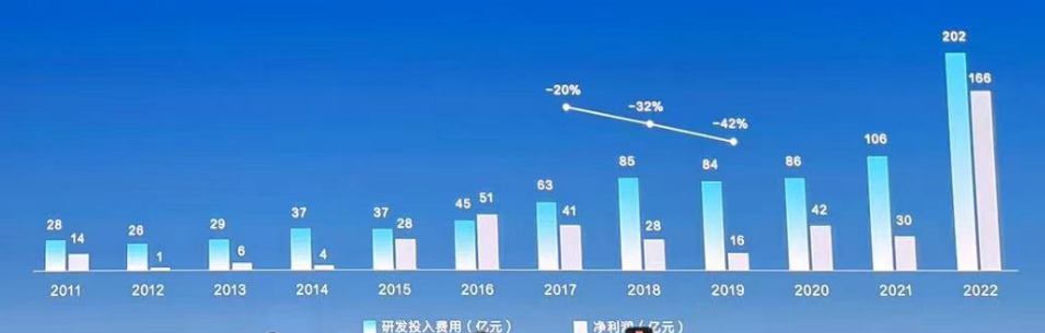 直到2015年比亚迪净利润有量的提升,上升到几十亿,2016年,净利润首次超过了研发投入;但2017年—2019年比亚迪再次应迎来净利润和研发投入的倒挂,2018年比亚迪净利润28亿,研发投入85亿。