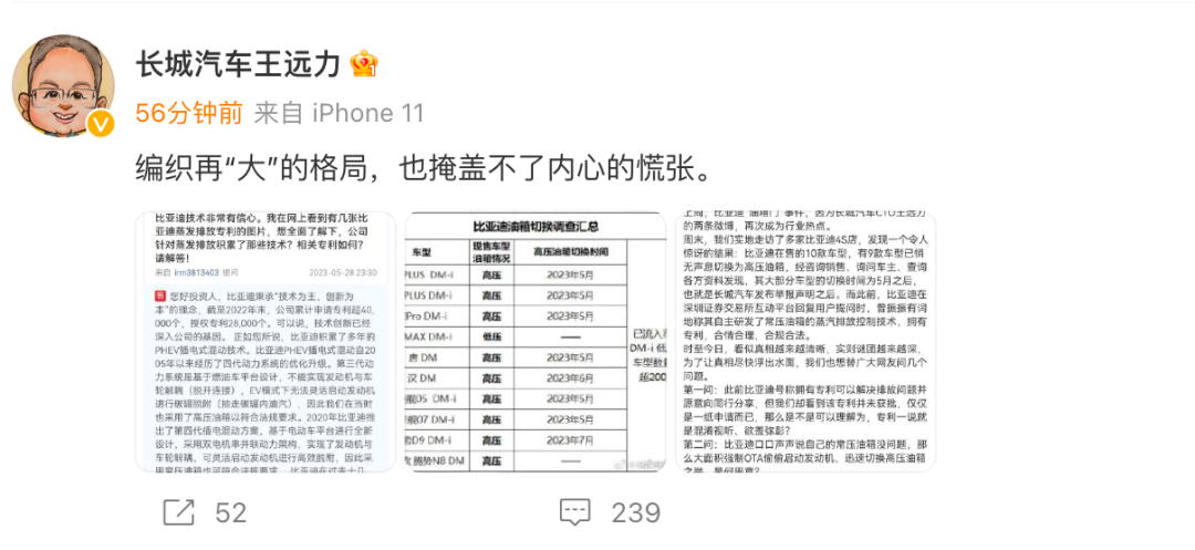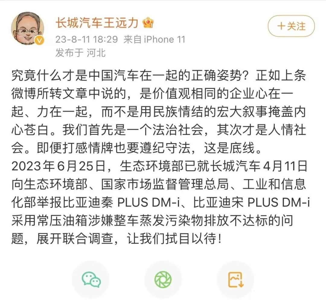 8月14日,长城汽车CTO王远力在社交平台再发声:“编织再‘大’的格局,也掩盖不了内心的慌张。”文字下附上三张截图,内容涉及比亚迪向投资人回应蒸汽排放专利、比亚迪5月份集中切换高压油箱等。