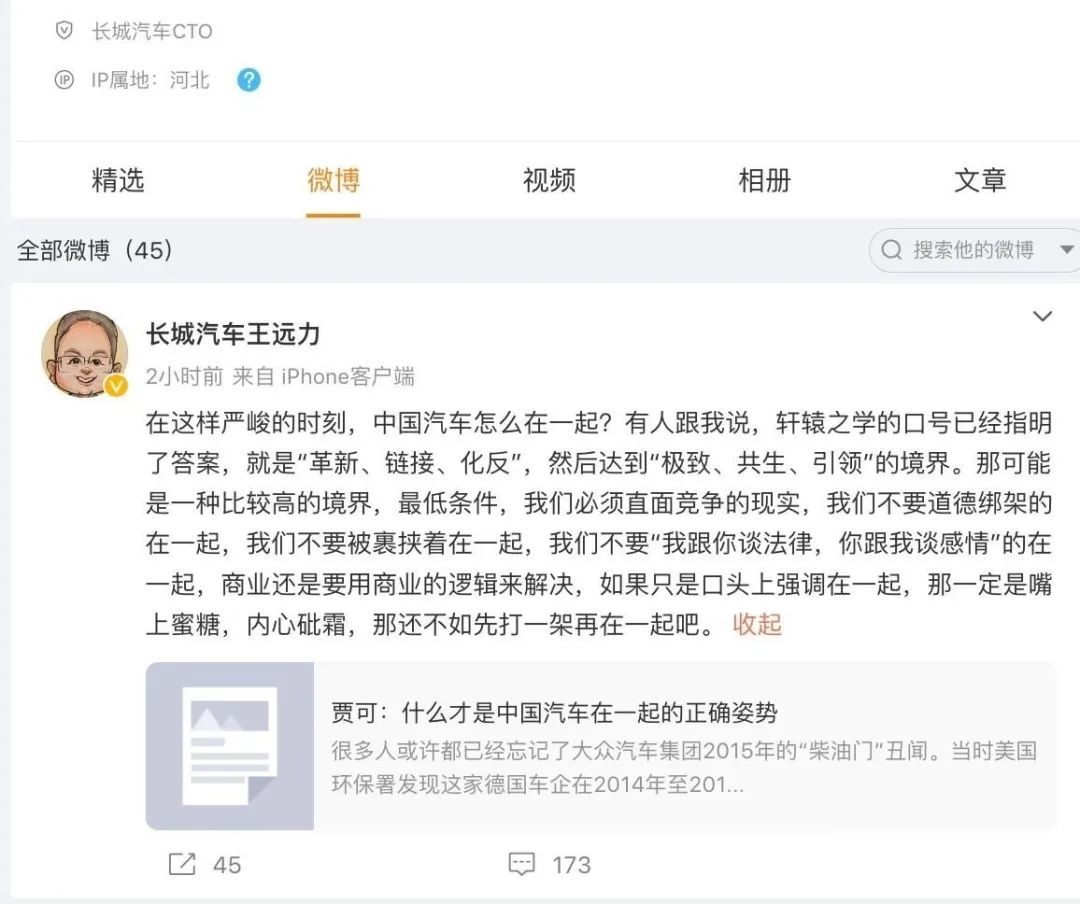 在这之后,王远力再度发声:究竟什么才是中国汽车在一起的正确姿势?其强调:“是价值观相同的企业心在一起、力在一起,而不是用民族情结的宏大叙事掩盖内心苍白。我们首先是一个法治社会,其次才是人情社会。即便打感情牌也要遵纪守法,这是底线。”