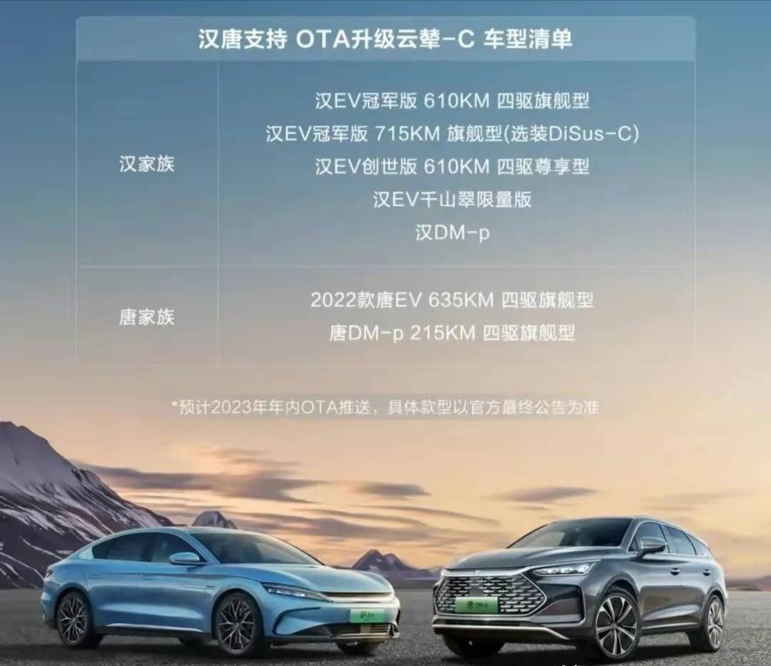 首先要说的就是排在首位的云辇-C智能阻尼车身控制系统,它是比亚迪在今年4月发布的一套车身控制系统,由云辇智探结构,云辇智控技术,云辇智算中心,关键零部件构成,重点可控制车辆在Z方向的变化,降低车辆侧翻概率,进一步提升驾乘体验,换句话说就是可以智能控制整个底盘系统;除仰望,腾势品牌外,比亚迪汉唐家族部分配置也支持OTA推送,其中汉家族中有五款车型支持,分别汉EV冠军版610KM四驱旗舰型、汉EV冠军版715KM旗舰型(选装DiSus-C)、汉EV创世版610KM四驱尊享型、汉EV千山翠限量版和汉DM-p等五款车型;
