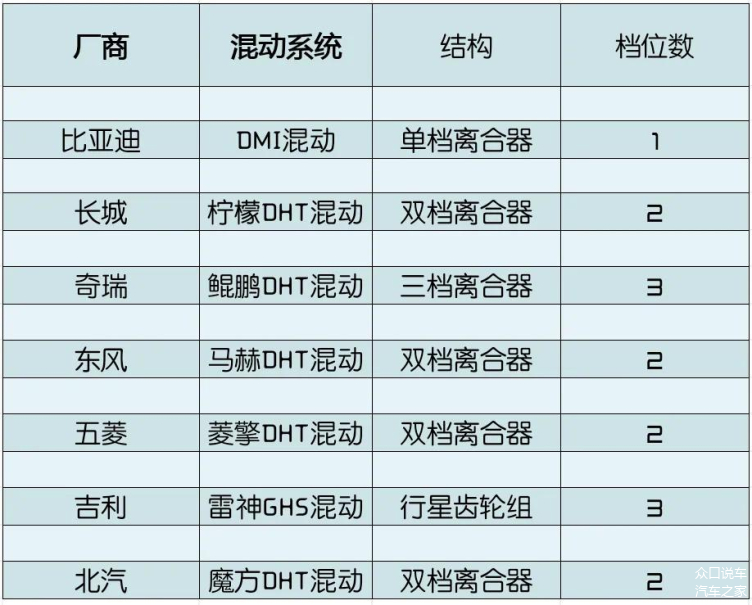 现在做插电混动的可不单单只有比亚迪,像是吉利、长城、奇瑞等也有自己混动体系,统一都叫做 DHT ,它和 DM 的主要区别就是用了 2-3 档的档位调节。