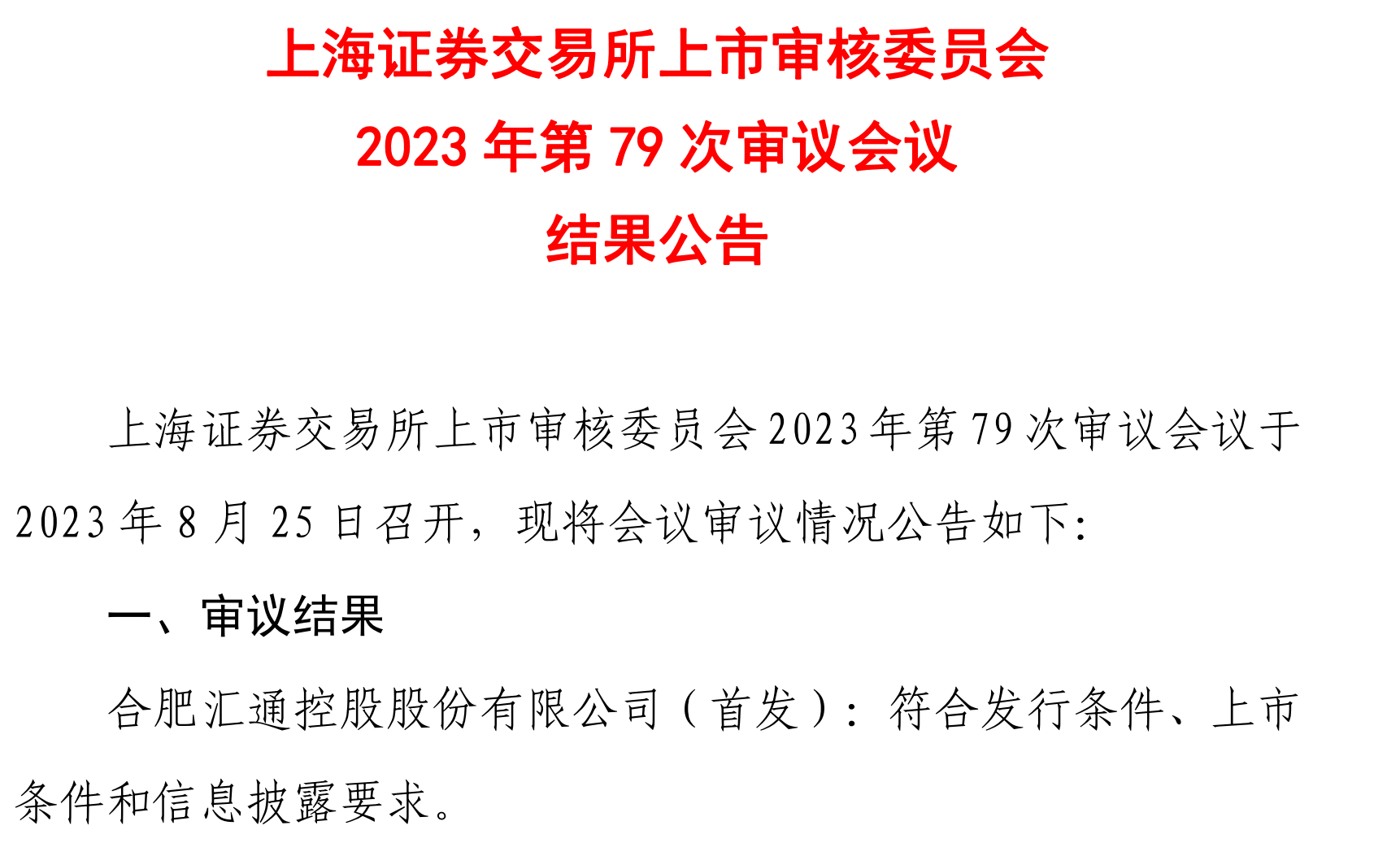 8月25日,据上海证券交易所上市审核委员会2023 年第 79 次审议会议结果公告,合肥汇通控股股份有限公司(以下简称“汇通控股”)首发符合发行条件、上市条件和信息披露要求。