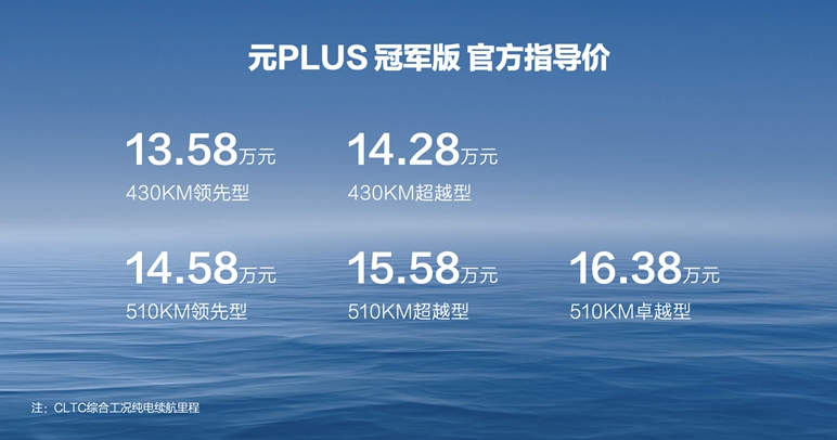 新车共推出五款车型,官方指导价13.58-16.38万元。起步价从老款的13.98万元下降到13.58万元,上市同期又给出了2000抵5000元现金优惠,价格直降7千元,实际上这意味着13.28万元即可拿下元PLUS这款纯电紧凑SUV。值得一提的是,比亚迪老款元PLUS在最新的8月份还斩获了24272辆的销量成绩。而随着性价比进一步提升的冠军版车型的推出,元PLUS势必将助力比亚迪今年突破300万的年销量目标。