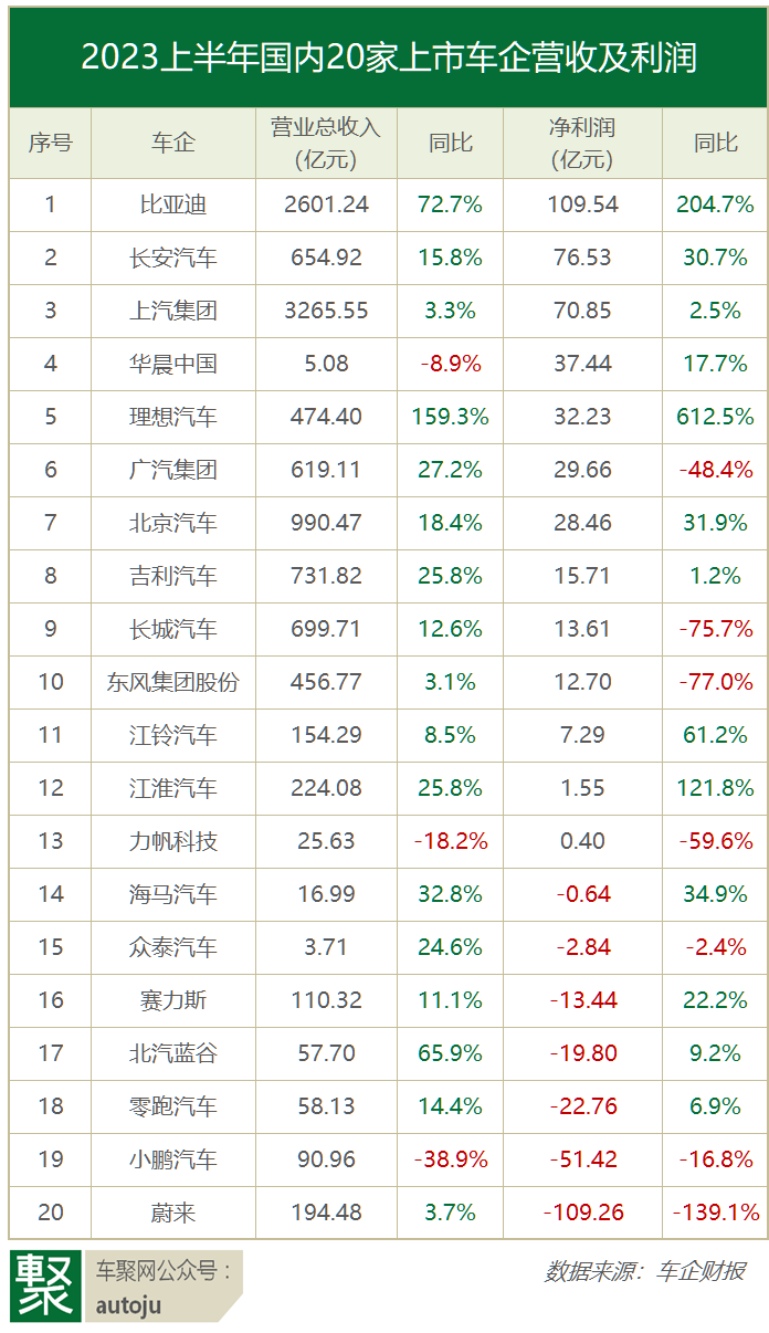 其中,最赚钱的是比亚迪。2023年上半年,比亚迪营业收入2601.24亿元,同比增长72.7%;净利润109.54亿元,同比激增204.7%。同时,它也是统计中唯一净利润超100亿的车企。