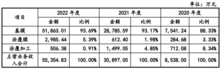 基膜是中兴新材的主要产品,2020-2022年,基膜产品的销售额分别为0.75亿元、2.88亿元和5.19亿元,占比分别为88.33%、93.17%和93.69%,呈现逐年上升的趋势。目前,中兴新材的基膜产品已进入比亚迪、宁德时代等知名企业。