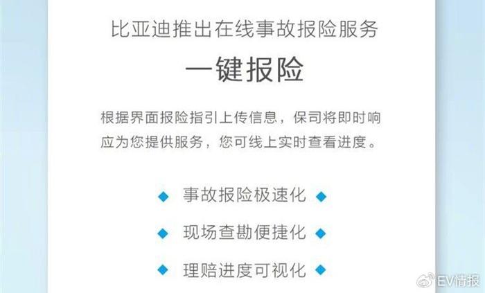 比亚迪表示,该服务有三大特色,分别是“事故报险极速化”、“现场查勘便捷化”、“理赔进度可视化”。