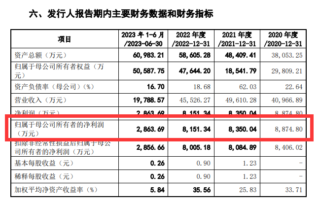 2020年-2022年及2023年1-6月(以下简称报告期),新广益实现营业收入分别为4.10亿元、4.96亿元、4.55亿元和1.98亿元,实现净利润分别为8874.80万元、8350.04万元、8151.34万元和2863.69万元。从业绩趋势来看,2022年及2023年上半年,公司收入出现下降,报告期内净利润则持续下滑。