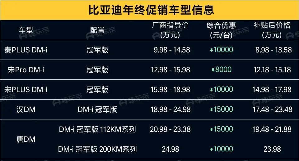 在新的销售政策中,比亚迪除了秦PLUS DM-i外,还包括了宋Pro DM-i、汉DM、唐DM等多款畅销车型。特别值得一提的是,唐DM-i冠军版的价格下调最高可达1.5万元,补贴后的价格为19.48万元起。不过,这些价格变动目前还未得到公司官方的确认。