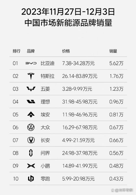 近日,理想汽车发布2023年11月27日-12月3日中国市场新能源品牌销量排行榜,共有3家车企周销量超万辆,比亚迪再次超5万辆,各车企具体销量我们一起来看看吧!