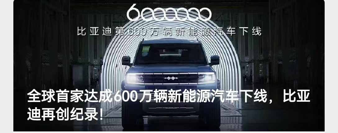 比亚迪从“第500万辆”到“第600万辆”仅用时3个多月,以迅猛之势再创产销新纪录。这不仅是比亚迪的又一里程碑,更是中国新能源汽车发展的缩影,进一步推动中国新能源汽车行业进入规模化、全球化的高质量发展阶段。