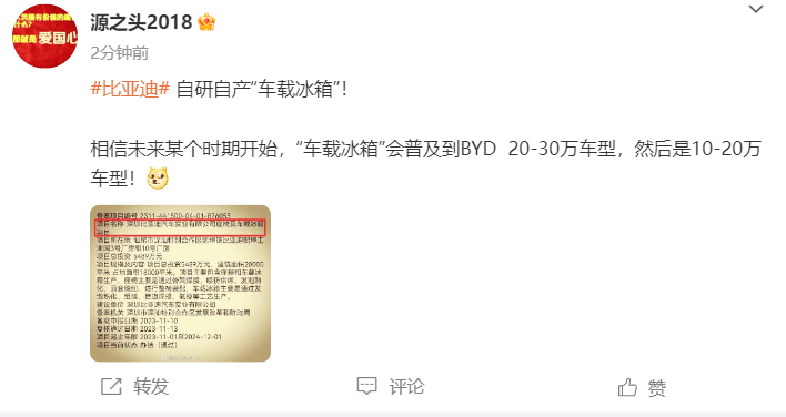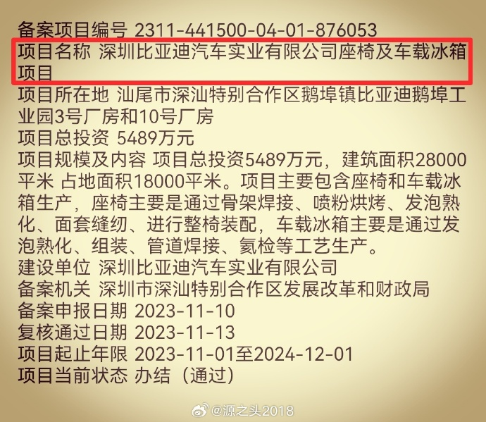 电动知家消息,12月26日,据网络博主发布的消息,比亚迪已自研自产“车载冰箱”!据其发布的项目介绍看,项目总投资 5489万元的深圳比亚迪汽车实业有限公司座椅及车载冰箱项目已审核通过。相信未来某个时期开始,“车载冰箱”会普及到BYD 20-30万车型,然后是10-20万车型!