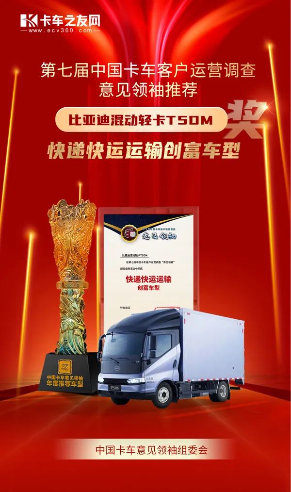 比亚迪针对当下物流用户面临的油车路权降级,但仍追求低成本、高运效、高路权、长续航、高舒适物流装备的需求,推出首款T5DM混动车型。2023年12月27日,在《卡车之友网》主办的“第七届中国卡车客户运营调查——意见领袖颁奖盛典”活动上,比亚迪T5DM混动车型荣获快递快运运输创富车型大奖。