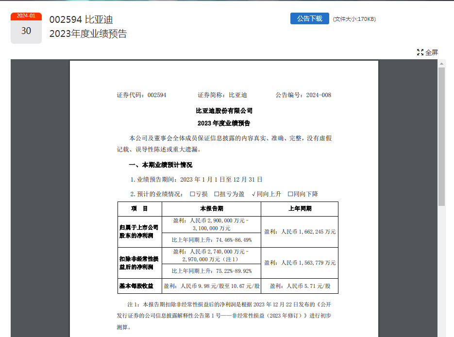 1月29日,比亚迪发布2023年业绩预告显示,期内公司预计实现净利润290亿元—310亿元,比上年同期上升74.46%—86.49%;预计实现扣非净利润274亿元—297亿元,比上年同期上升75.22%—89.92%。