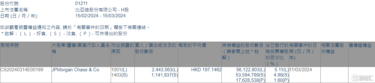 格隆汇3月15日丨根据联交所最新权益披露资料显示,2024年3月11日,比亚迪股份(01211.HK)获JPMorgan Chase & Co.以每股均价197.1462港元增持好仓244.36万股,涉资约4.82亿港元。