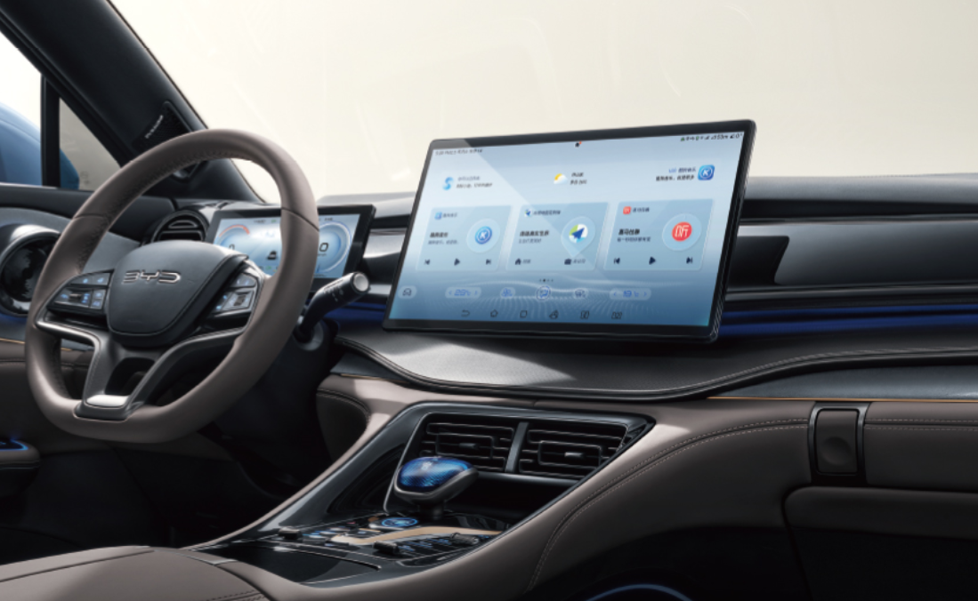 座舱方面,护卫舰 07 全系标配 15.6 英寸自适应旋转中控屏,搭载 DiLink 智能网联系统,配备了 HiFi 级定制丹拿音响,支持 5G 技术、四音区语音唤醒以及 20 秒连续对话等。