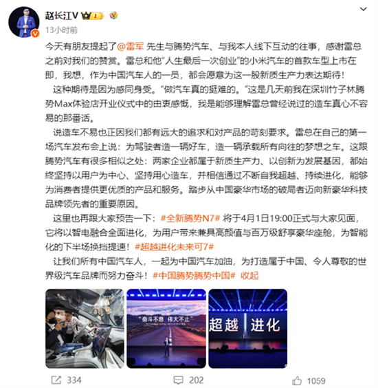 赵长江称:今天有朋友提起了雷军先生与腾势汽车、与我本人线下互动的往事,感谢雷总之前对我们的赞赏。