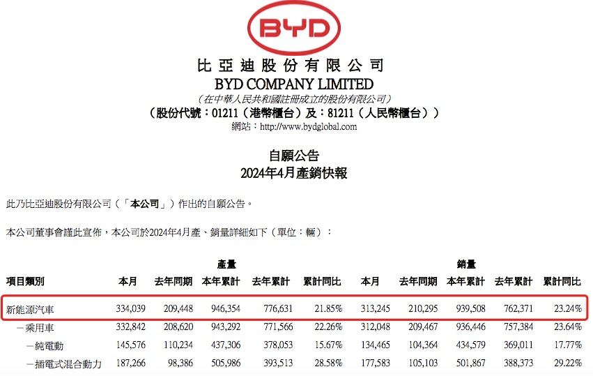 今年1-4月,比亚迪新能源汽车销量累计93.95万辆,同比增长23.24%。3-4月,公司月度销量均超30万辆。