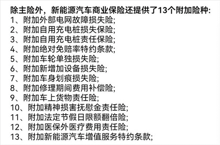在强制性的交通事故责任保险和商业保险之外,比亚迪还提供13种附加险种,包括外部电网故障的保险、自用充电桩的保险等。
