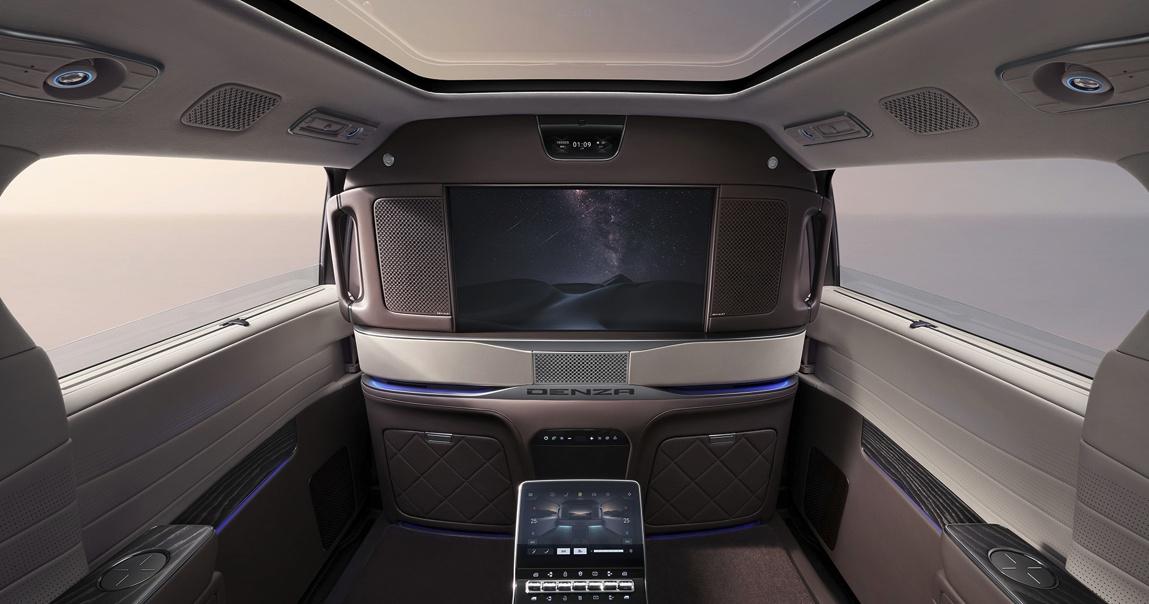 腾势 D9 四座创领版前排布局和普通版车型基本保持一致,后排座椅为两张独立的航空座椅,后舱还配备了一块大尺寸的电视屏幕、全景天窗、麂皮材质的顶棚,后舱中央还有一个液晶控制屏,可以控制车内的各项功能,两侧还有无线充电面板和升降杯托。