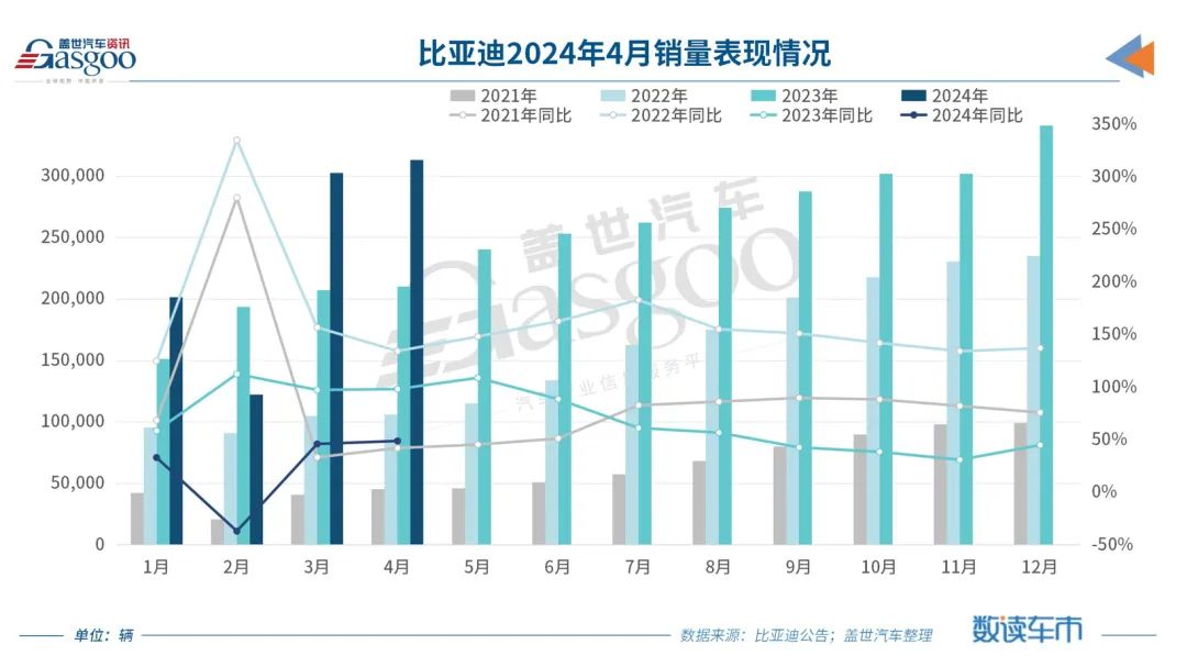 4月,比亚迪销售313,245辆新能源车,较去年同期增长了48.96%,环比3月微增3.57%。具体到各品牌,比亚迪王朝/海洋品牌、腾势、方程豹、仰望品牌该月分别销售了297,864 辆、11,122辆、2,110辆以及952 辆新车。1-4月,比亚迪累计销量已达939,508辆,同比增长超23%。