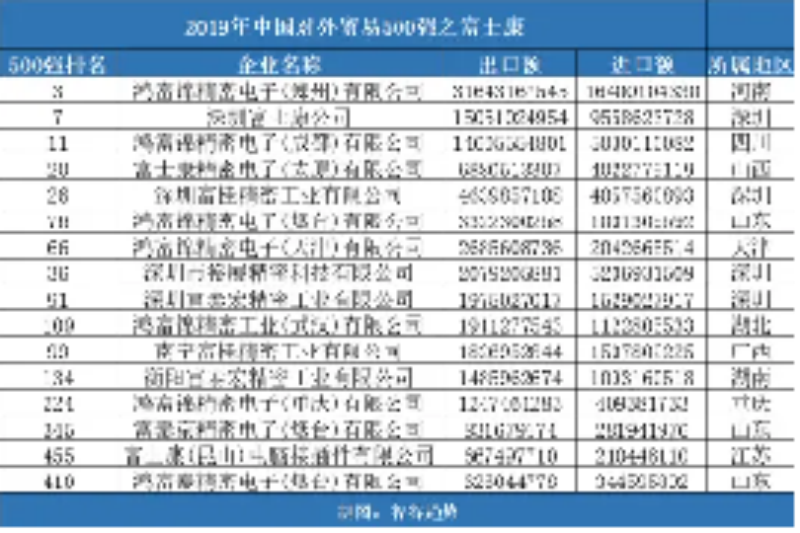在2019年中国对外贸易500强榜单上,“富士康军团”的出口总额高达914.79亿美元,占整个500强出口总额的14%。