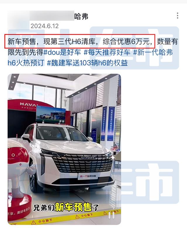 在新一代H6上市前,第三代H6开始清库,综合优惠达6万元,但市场表现仍不及预期。今年5月,哈弗H6上险量9,615辆,同比暴跌41.6%。