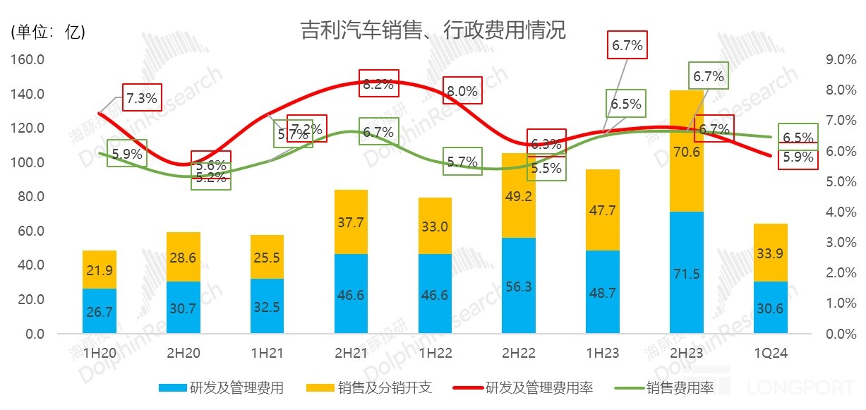 吉利 2024 年一季度净利 14.2 万,基本符合海豚君预期,销售费用相对刚性,营销费用主要用于吉利新能源品牌极氪,领克和银河的新车上市,研发及管理费用相对克制,其中极氪一季度研发费用大幅削减,经营费用率从 23 年下半年 13.4%环比下滑 1%至 24 年一季度 12.3%。