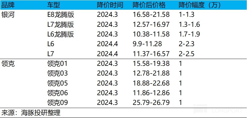 分品牌来看,一季度极氪毛利率仅 12%,相比 23 年下半年 15.2%下滑 3%,银河由于 3 月对龙腾版降价促销(降价幅度 1-2 万),预计毛利率也呈现环比下滑趋势。