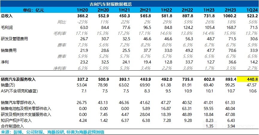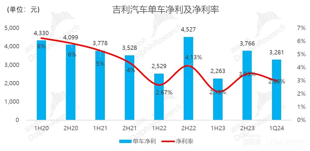 从单车 ASP 来看(海豚君按照汽车销售收入占总收入的比例与 23 年下半年持平来预计),一季度吉利单车收入据估算约 10.6 万元,基本与 23 年下半年持平。