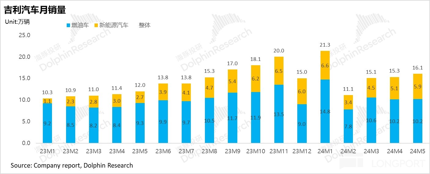 从销量端来看,2024 年一季度总销量 48 万,同比提升 48%,一方面由于 23 年一季度正处于吉利新能源转型期,新能源车基数较低,另一方面由于 24 年一季度吉利旗下燃油车销量表现不错,中国星系列处于热卖状态,实现同比增长。